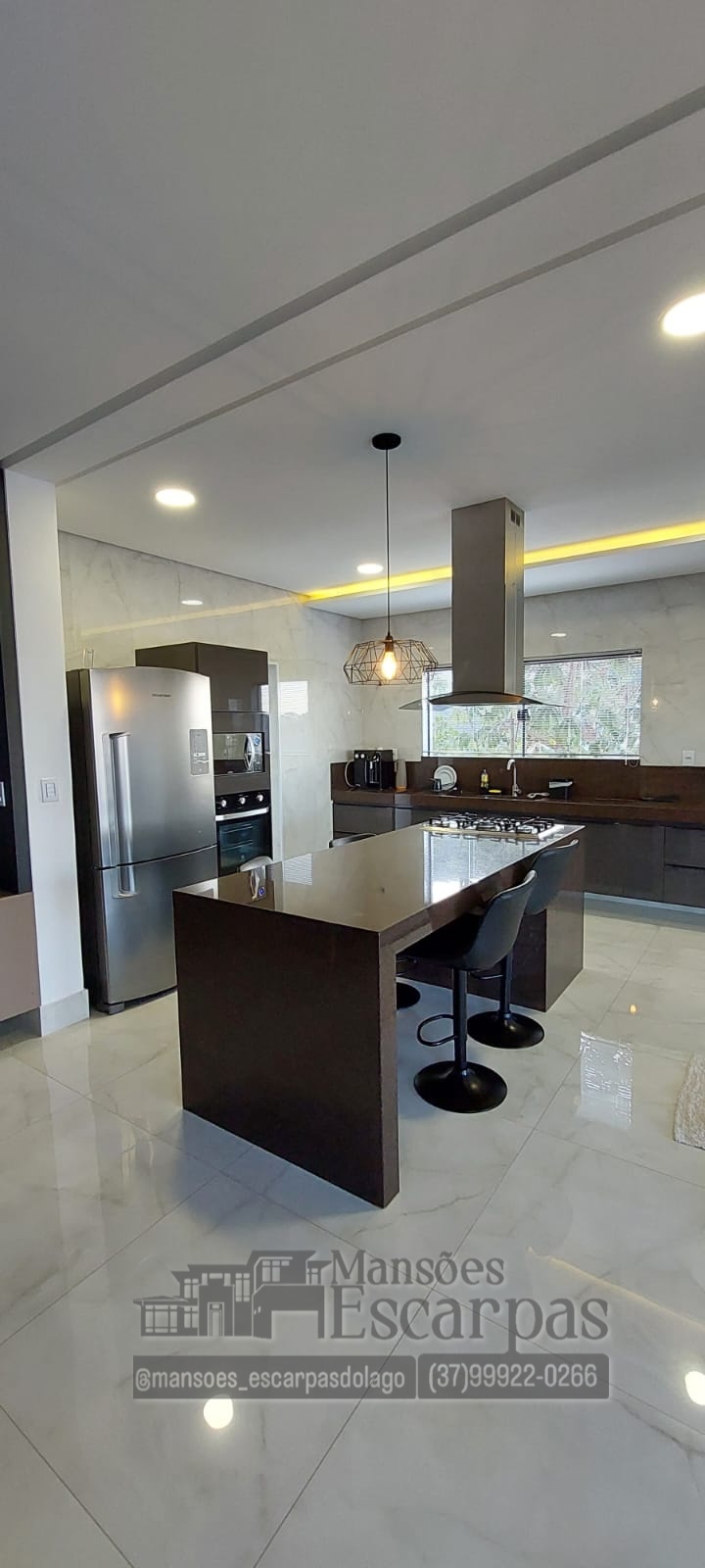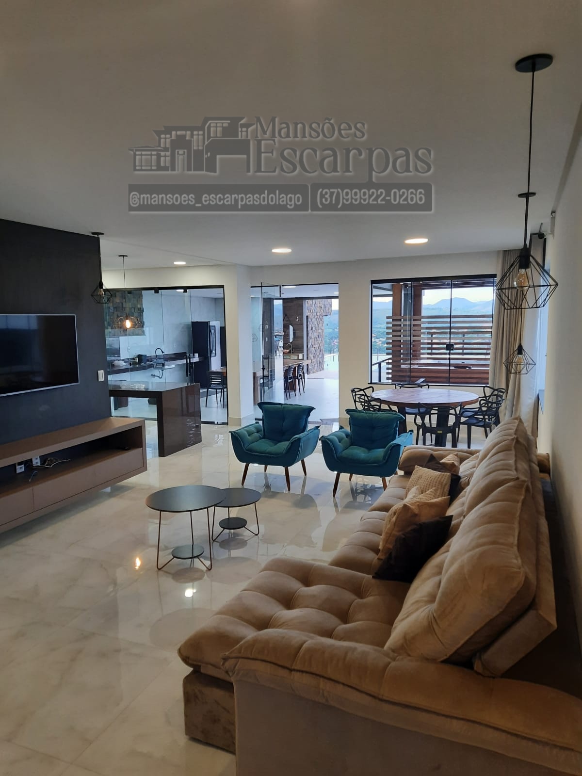 Cozinha com utensílios domésticos, fogão, filtro de água. Sala de TV com televisão grande e sofá super confortável.